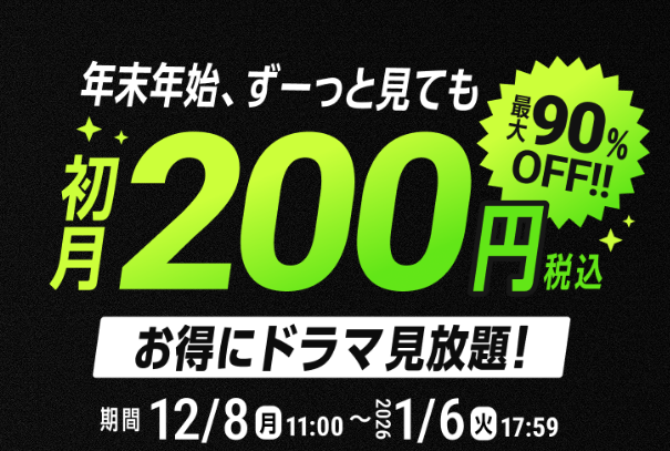【~1月6日17:59まで】スタートプライス! 初回登録で最初の1ヵ月200円で見放題