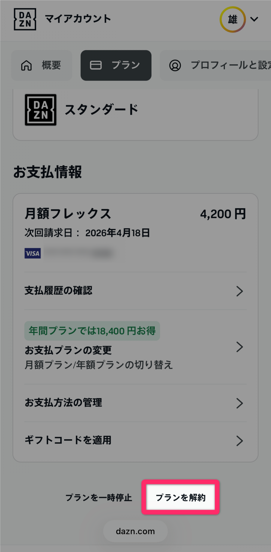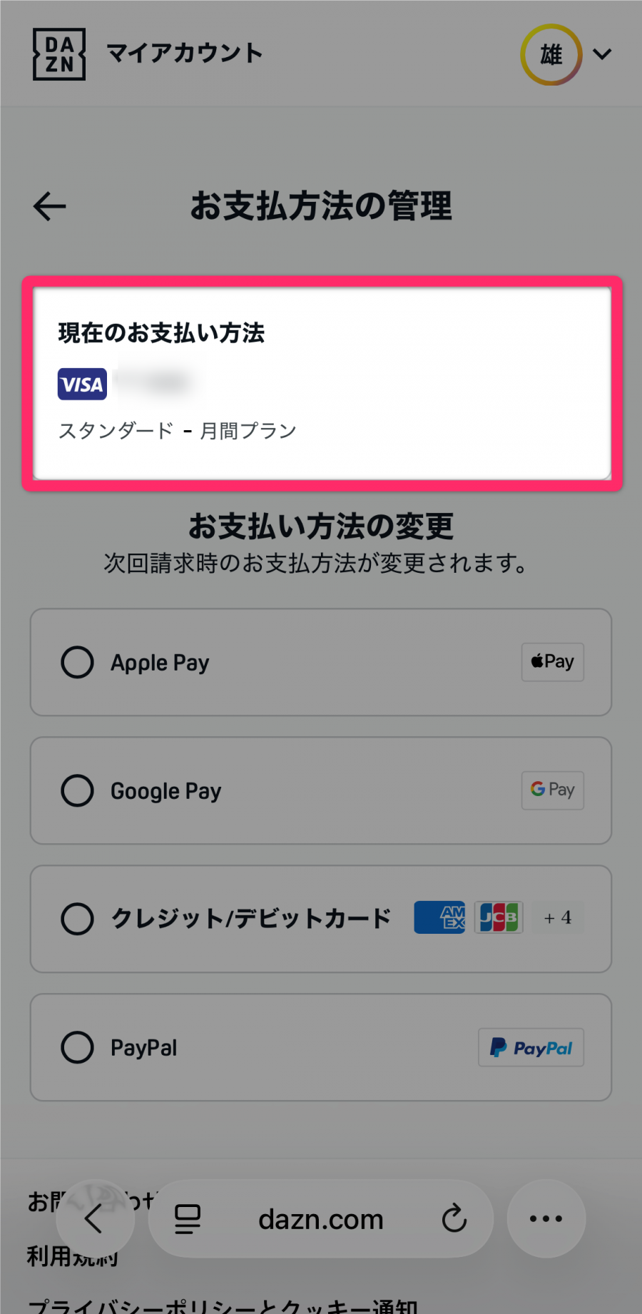 支払い方法がクレジット/デビットカード、PayPal、DAZNプリペイドカード、DAZNチケットの場合は、Webブラウザから解約できます。