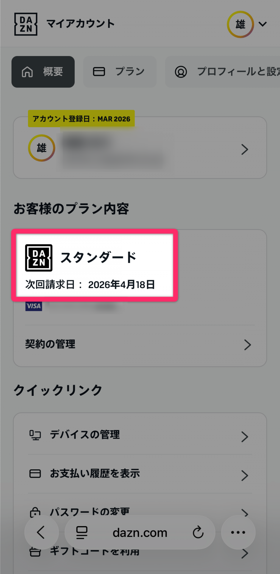 退会通知期間の30日間が、次回請求日をまたいでしまう場合、そのはみ出した日数分が「日割り計算」で請求されます。次回請求日はDAZNを登録した日の翌月同日です(例:3月18日なら4月18日)。正確な日付は「マイ・アカウント」ページで確認できます。