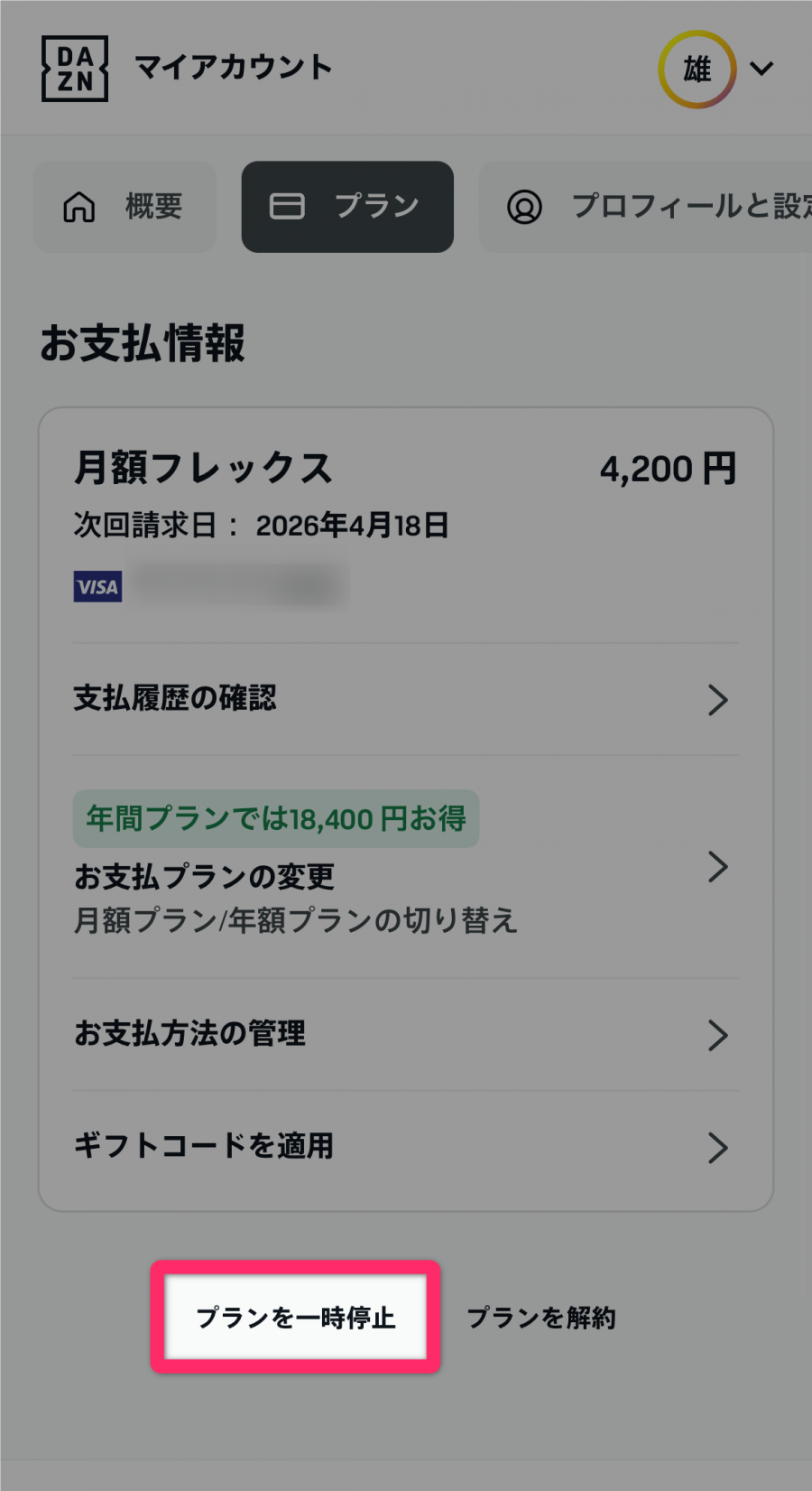 [プランを一時停止]をタップ