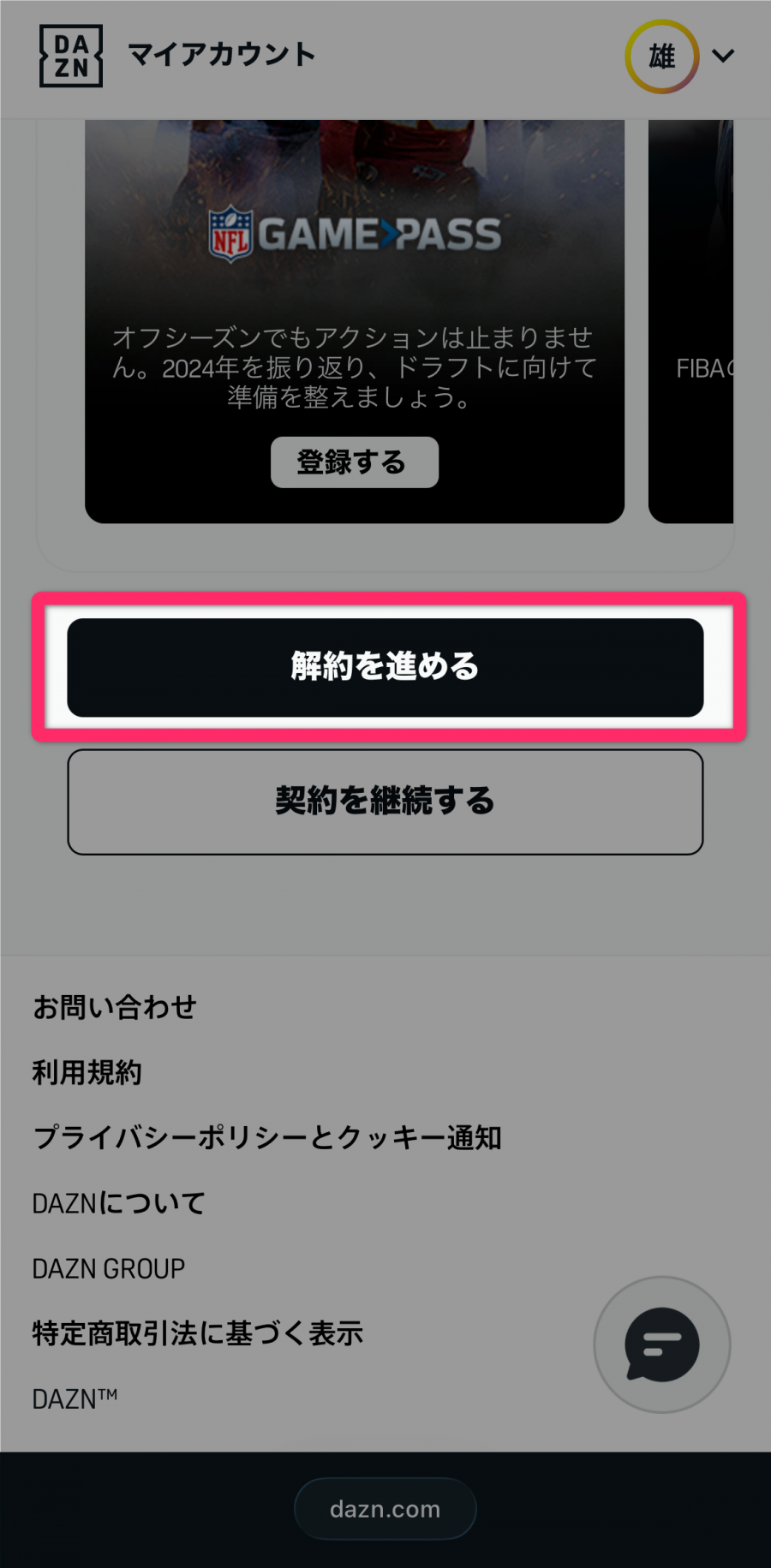 DAZNアプリ内から解約できません。SafariやChromeなどのブラウザからログインし直してください。また、登録経路によって解約手続きのやり方が変わります。