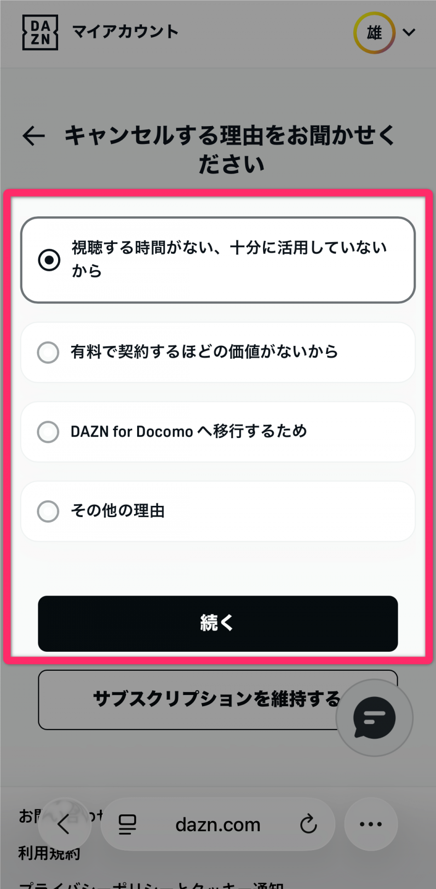 キャンセル理由を選択して[続く]をタップ