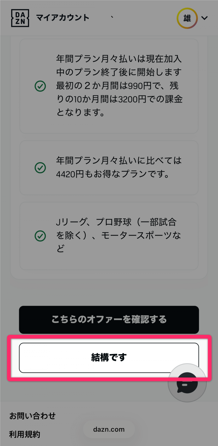 DAZNには電話でのカスタマーサポート窓口は用意されていません。基本的にはマイ・アカウントからのセルフ操作となりますが、エラー等で進めない場合は公式サイトのヘルプページ右下にある「チャットボット」を利用しましょう。