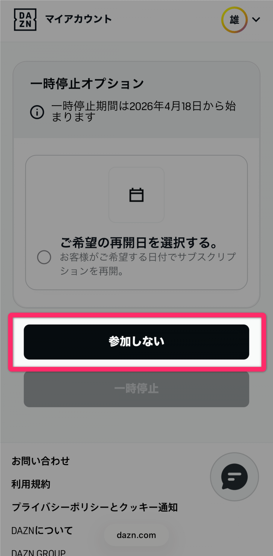 DAZNの一時停止機能は、次回請求日までは希望した再開日の変更およびキャンセルが可能です。