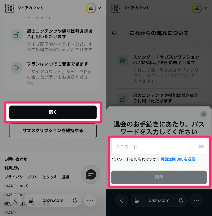 無駄な引き止めに惑わされず、最短で手続きを終えるための登録先・デバイス別の解約手順を紹介。どの登録経度であってもDAZNアプリからは解約できません。Google ChromeやSafariといったWebブラウザから解約してください。