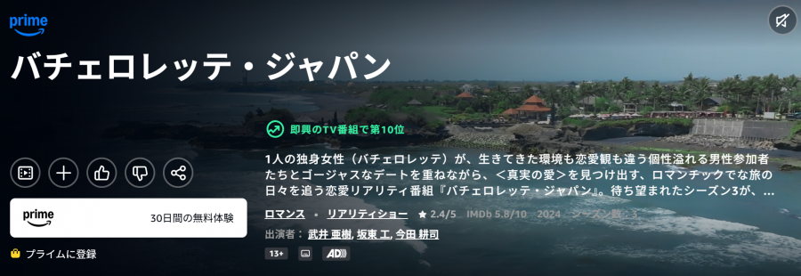 バチェラー・バチェロレッテシリーズは、シーズン1〜3(過去作)もすべてAmazonプライム・ビデオで視聴可能です。 30日間の無料体験中に一気見するのもおすすめです。