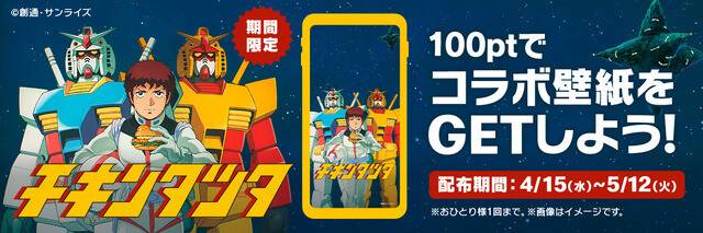 公式アプリを通じて商品を購入すると税込10円ごとに1ポイントが付与されるリワードプログラム。今回のチキンタツタ発売を記念して、ガンダムとアムロ、ガンダム チキンタツタ専用が描かれた限定壁紙を100ポイントで交換可能です。ここでしか手に入らないコラボ限定デザインのため、アプリユーザーはポイントを確認しておきましょう。
