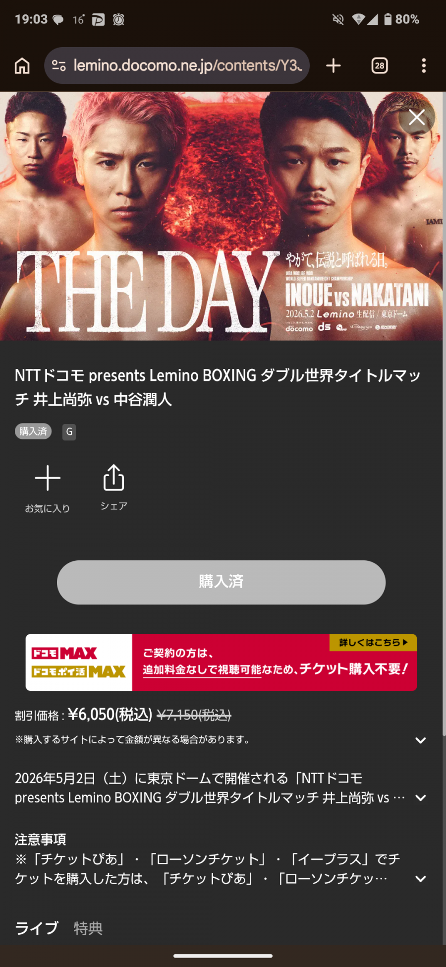 「ドコモ MAX」「ドコモ ポイ活 MAX」を利用の方は、「Lemino ペイ・パー・ビュー配信(PPV)」のお試し視聴として、追加料金なし&PPVチケットの購入も不要で「NTTドコモ presents Lemino BOXING ダブル世界タイトルマッチ」の全7試合を観ることができます。